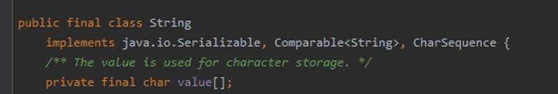 실제 intellj를 이용해 String 구현된 Class를 확인해보니 private final char value[]로 선언되어 있음.