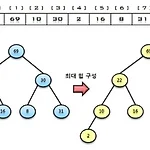 힙 정렬(Heap Sort): 힙 자료구조를 이용한 정렬 방법: 힙에서 항상 가장 큰 원소가 루트노드가 되고 삭제 연산을 수행하면 항상 루트노드의 원소를 삭제하여 반환 힙 정렬 수행 방법1. 정렬한 원소들을 입력하여 최대 힙 구성2. 힙에 대하여 삭제 연산을 수행하여 얻은 원소를 마지막 자리에 배치3. 나머지 원소에 대해서 다시 최대 힙으로 재구성 (원소의 개수만큼 반복 수행) 정렬되지 않은 [69,10,30,2,16,8,31,22]의 자료들을 힙정렬-> 정렬할 원소가 8개 이므로 노드가 8개인 완전 이진 트리를 만들고 최대 힙으로 구성1. 힙에 삭제 연산을 수행하여 루트 노드의 원소 69를 구해서 배열의 마지막 자리에 저장한다. 그리고 나머지 원소들에 대해서 최대 힙으로 재구성 평균 시간복잡도 : O(..